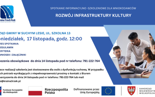 Zapraszamy na spotkanie informacyjno-szkoleniowe dotyczące naboru FEWP.08.01-IZ.00-002/25 – „Rozwój infrastruktury kultury”. Termin: poniedziałek, 17 listopada 2025 r.Godzina: 12:00Miejsce: Urząd Gminy Suchy Las Zgłoszenia obowiązkowe do dnia 14 listopada...Read More